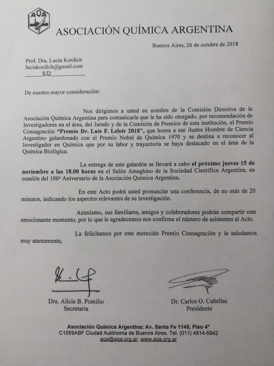Tenemos el agrado de comunicar que en el día de hoy, jueves 15 de noviembre, la Asociación Quimica Argentina le entregará a la Prof. Dra. Lucía Kordich el Premio Consagración “Premio Dr Luis Leloir 2018” por su trayectoria y sus contribuciones al área de Quimica Biologica.